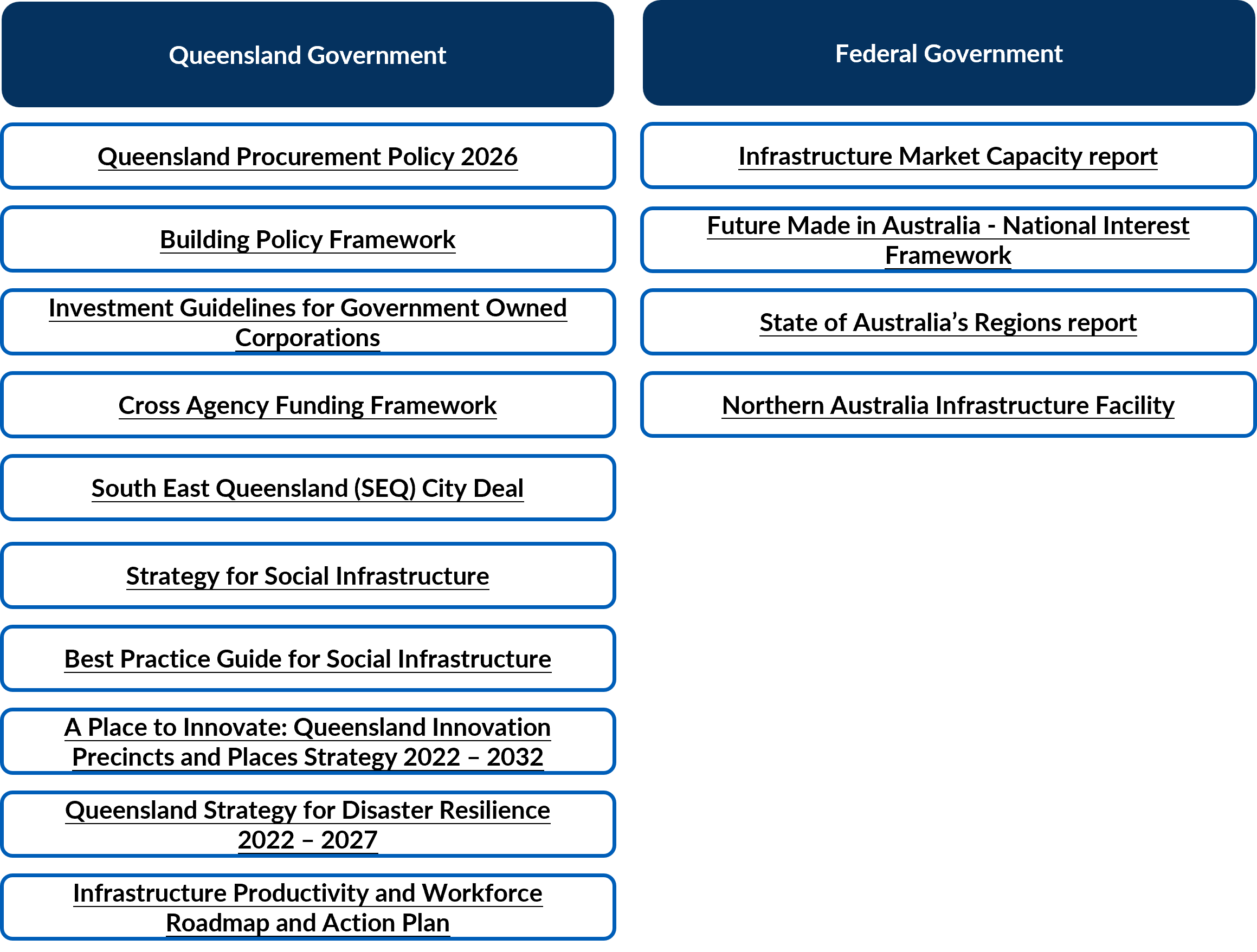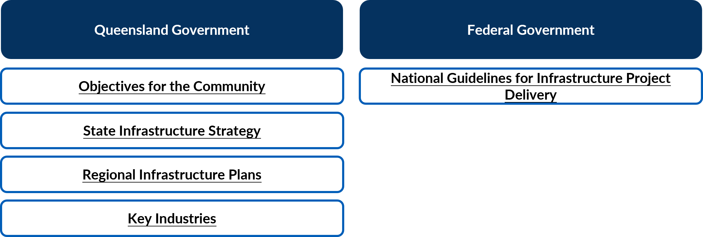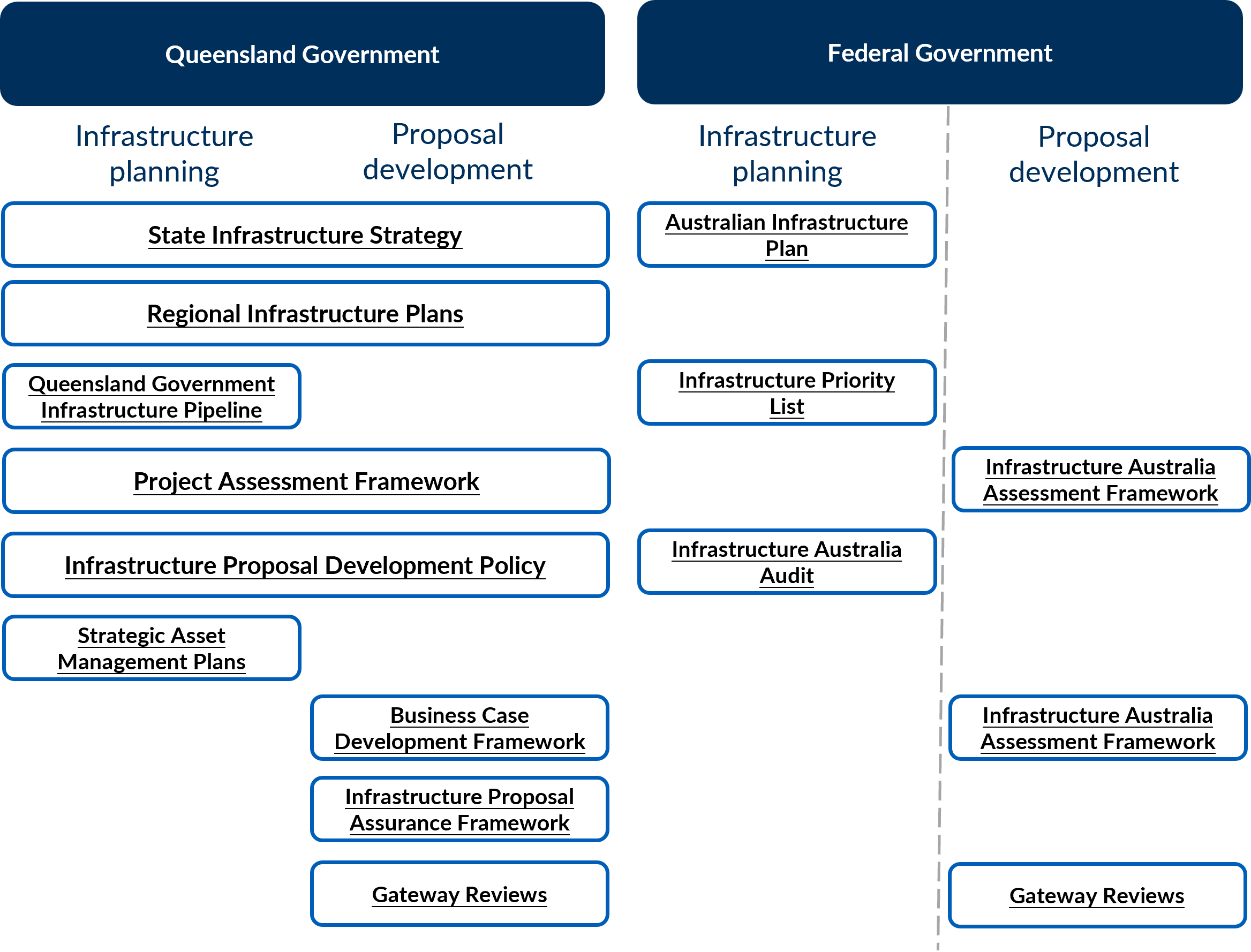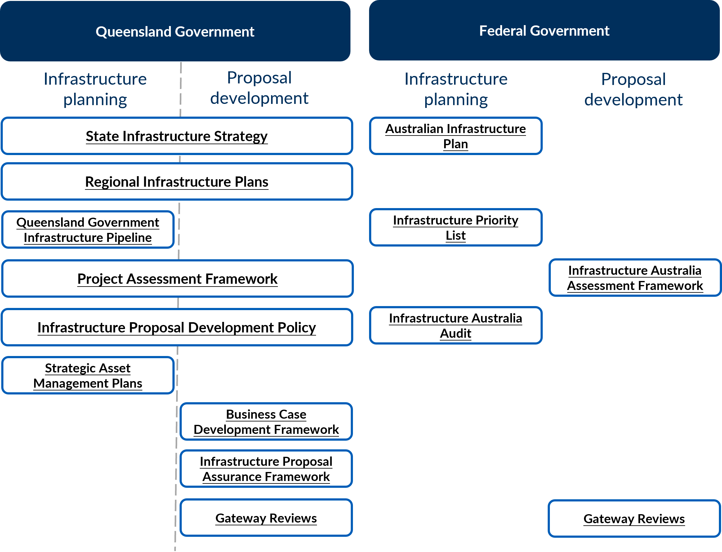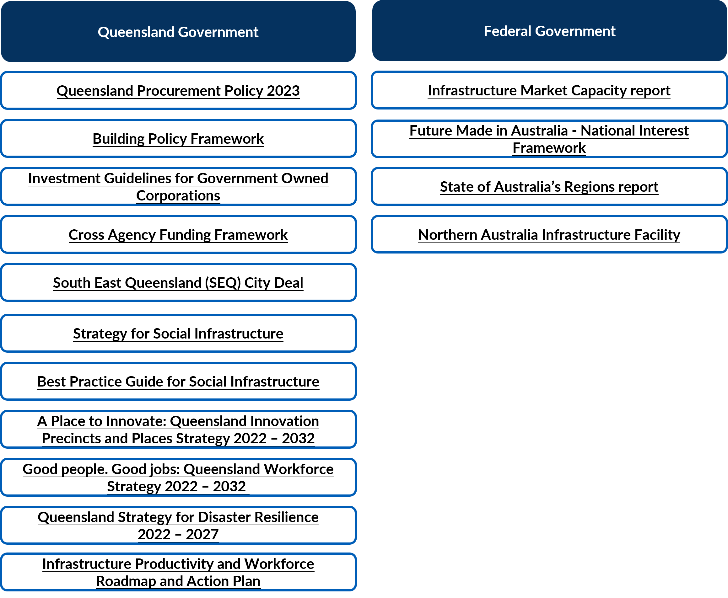 There are a number of key frameworks, policies, strategies, plans and guidelines at both State and Commonwealth level that underpin infrastructure proposal development and delivery, and can support and inform agencies’ development of infrastructure proposals.